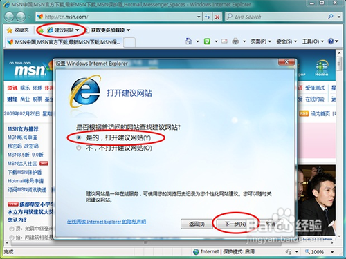 初次启动 IE8 时,会出现欢迎使用的提示框,请点击“下一步”继续。