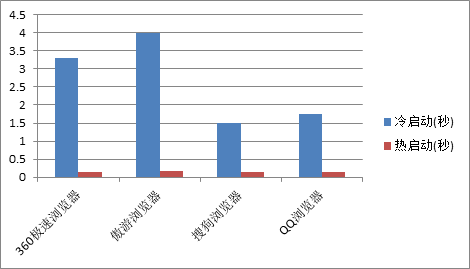 冷启动的测试结果可分为两组,360极速浏览器和傲游浏览器为一组,搜狗浏览器和QQ浏览器为二组。一组的启动速度约为二组的两倍。究其原因,是搜狗浏览器和QQ浏览器均使用了预读技术, 大大加快了冷启动的速度。对于经常需要在不同场所奔波做演示的商务用户来说,更快的启动速度意味着能留给客户更好的印象。而热启动的速度则相差不大。
