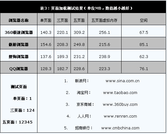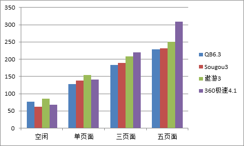 加载页面的情况下,QQ浏览器的内存占用最低、其次是搜狗浏览器、360极速浏览器,而傲游浏览器的内存占用最高。