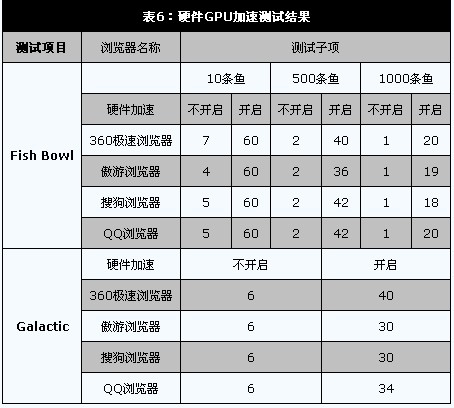 从测试结果可以看出,硬件GPU加速的效果非常明显,能够大幅提高测试的成绩。而不同浏览器的优化也不经相同,依然是360极速浏览器和QQ浏览器的成绩分居一二位。