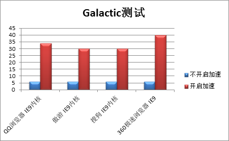 我们使用微软提供的两个测试项目Flash Bowl和Galactic进行测试,由于Webkit核心不支持GPU硬件加速,因此此项测试只测试IE9核心。