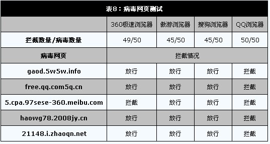 安全性测试的结果令人有些意外,以安全软件起家的360竟然在此项测试中以1项之差败给腾讯;而傲游浏览器和搜狗浏览器的表现则稍差,均有5项没有拦截。毕竟360和腾讯均有客户端的安全防护软件经验,出现这种结果其实也在情理之中。