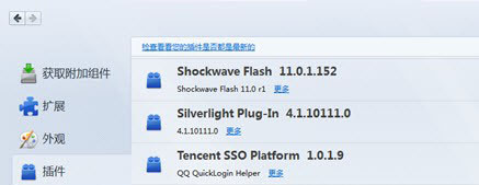 与扩展不同,插件是由第三方公司提供和进行维护的(比如Adobe Flash插件),注册到系统中,火狐只是从系统中调用,所以无法在火狐浏览器中进行自动更新。但是,火狐为用户提供了一个入口,来检查当前安装的插件版本是否需要更新:在附加组件中打开插件标签,最上方会看到:“检查看看您的插件是否都是最新的”。