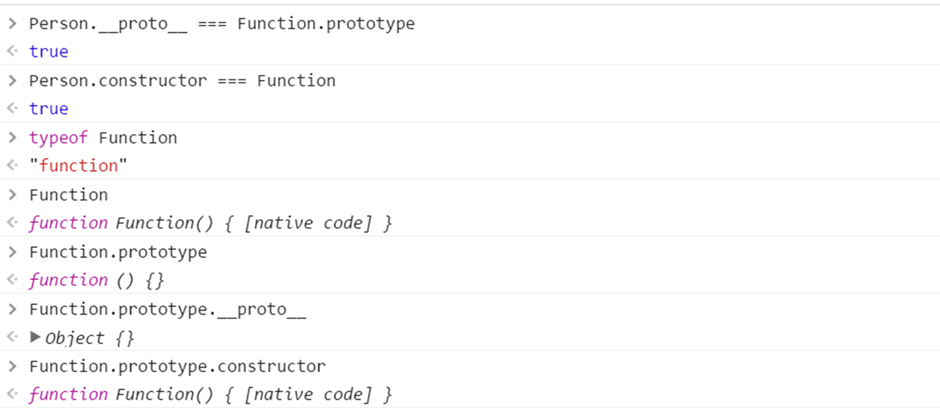 console.log(Person.__proto__ === Function.prototype); console.log(Person.constructor === Function) console.log(typeof Function); console.log(Function); console.log(Function.prototype); console.log(Function.prototype.__proto__); console.log(Function.prototype.constructor);