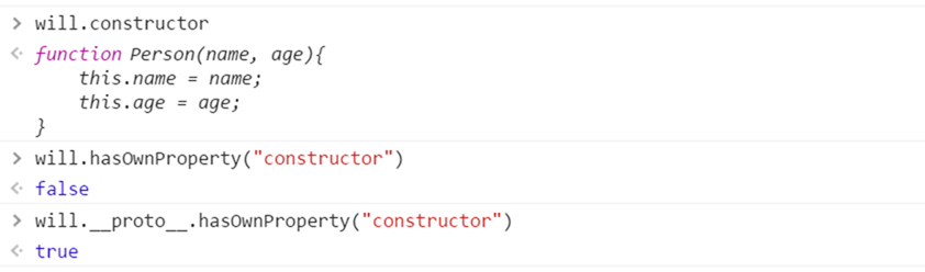 console.log(will.__proto__ === Person.prototype); console.log(Person.prototype.__proto__); console.log(Person.prototype.constructor); console.log(Person.prototype.constructor === Person);