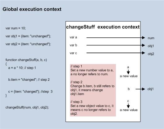 执行到changeStuff(num, obj1, obj2)的时候, a, b, c指向参数num, obj1, obj2,a和num指向10, b跟obj1指向同一个值,c跟obj2指向同一个值。