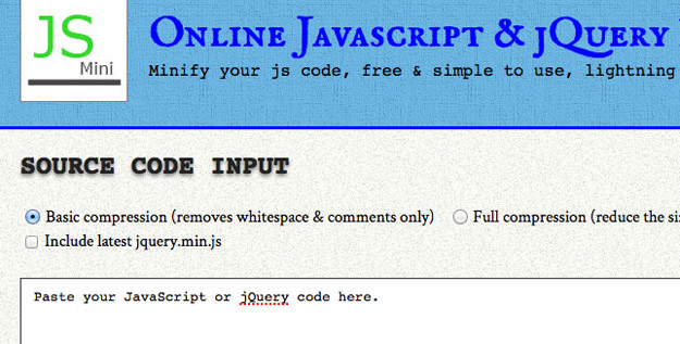 如果你想快速、轻松地压缩JavaScript或jQuery文件,那么可以使用jsMini。只需复制粘贴源代码,选择是否要基本或完全压缩,然后就ok了。