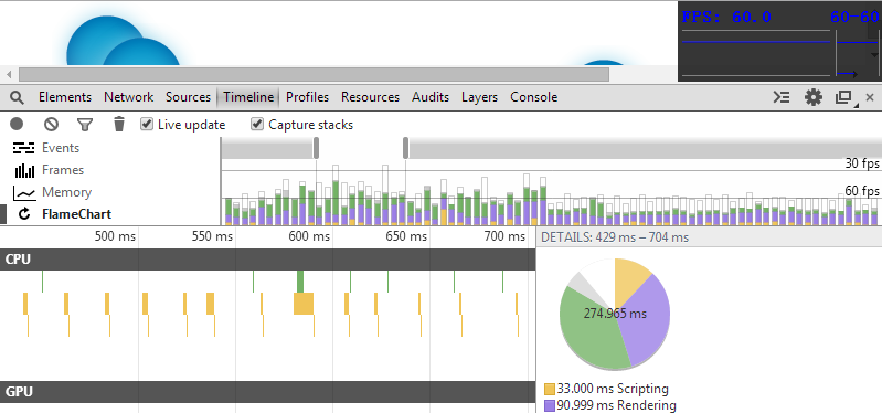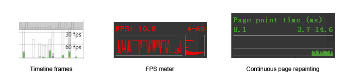 页面是每一帧变化都是系统绘制出来的(GPU或者CPU)。但这种绘制又和PC游戏的绘制不同,它的最高绘制频率受限于显示器的刷新频率(而非显卡),所以大多数情况下最高的绘制频率只能是每秒60帧(frame per second,以下用fps简称),对应于显示器的60Hz。60fps是一个最理想的状态,在日常对页面性能的测试中,60fps也是一个重要的指标,the closer the better。在Chrome的调试工具中,有不少工具都是用于衡量当前帧数: