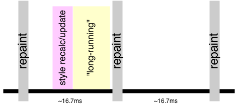 - 更新背景颜色的代码过于提前,根据前一个例子,我们知道,即使在这里告知了浏览器我需要更新背景颜色,浏览器至少也要等到js运行完毕才能调用UI线程;