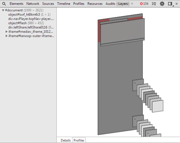 这和游戏中的3D渲染类似,虽然我们看到的是一个立体的人物,但这个人物的皮肤是由不同的图片“贴”和“拼”上去的。网页比此还多了一个步骤,虽然最终的网页是由多个位图层合成的,但我们看到的只是一个复印版,最终只有一个层。当然有的层是无法拼合的,比如flash。以爱奇艺的一个播放页(http://www.iqiyi.com/v_19rrgyhg0s.html)为例,我们可以利用Chrome的Layer面板(默认不启用,需要手动开启)查看页面上所有的层: