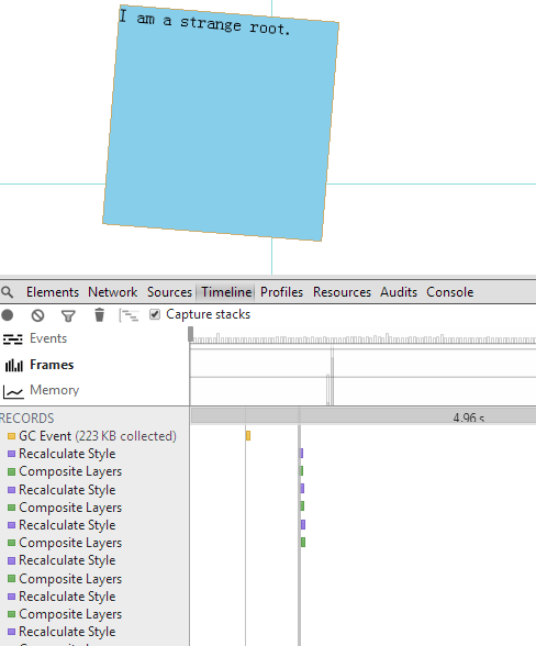 DEMO版本之所以慢的原因是,在修改每一个物体的left值时,会请求这个物体的offsetTop值。这是一个非常耗时的reflow操作(具体还有哪些耗时的reflow操作可以参考这篇:?How (not) to trigger a layout in WebKit)。这一点从Chrome调试工具中可以看出来(截图中的某些功能需要在Chrome canary版本中才可启用)