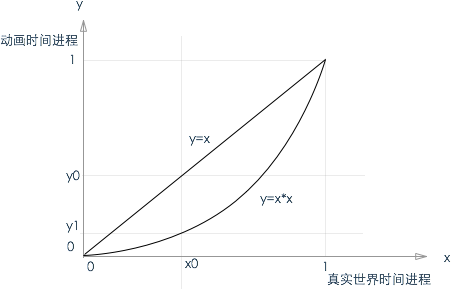 在真实世界的时间进行到x0的时候,动画进程原本应该进行到y0,在进行变换之后,只进行到y1。到最后,百川归海,两条线交汇于点(1, 1)。这里,y = x * x是变换函数(easing function)。