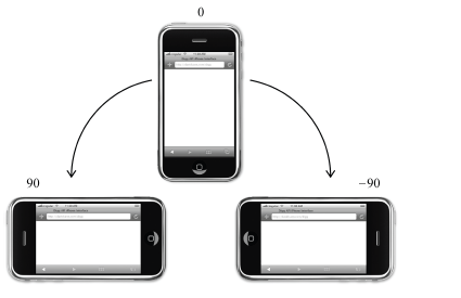 苹果公司为移动safari添加的orientationchange事件是能让用户确定何时将设备由横向查看模式切换到纵向模式触发的事件;此属性中包含三个值,0表示肖像模式;90表示向左旋转的横向模式(主屏幕按钮在右侧),-90表示向右旋转的横向模式(主屏幕按钮在左侧),如下图所示: