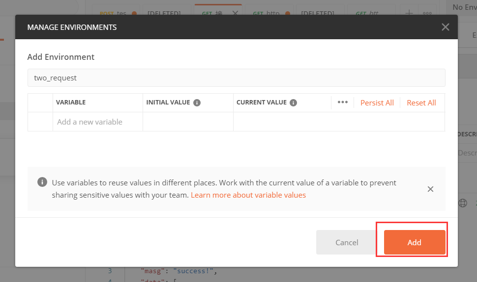 记得两个请求需使用同一个环境变量