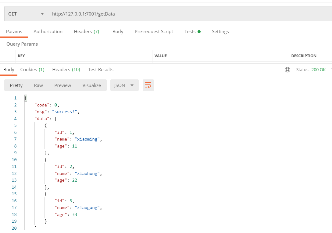 第一个接口的返回值如下,假设我们需要获取第一个接口返回值data的第一个元素的id,然后传给第二个接口