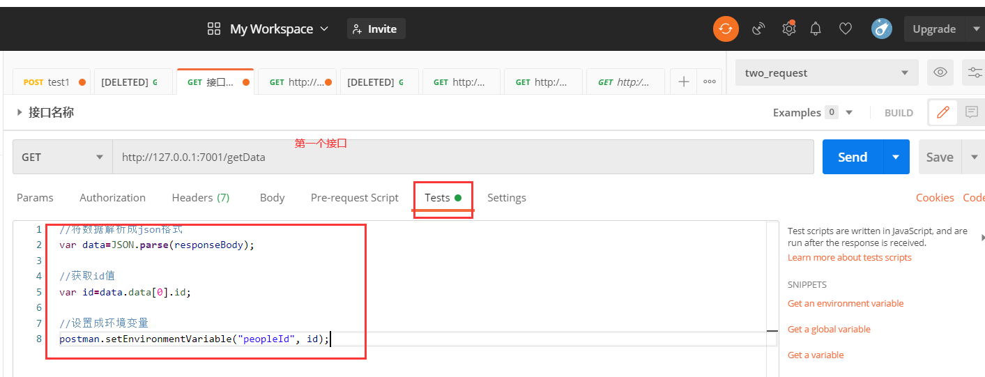 在postman中将第一个请求的响应参数传到下一个请求中