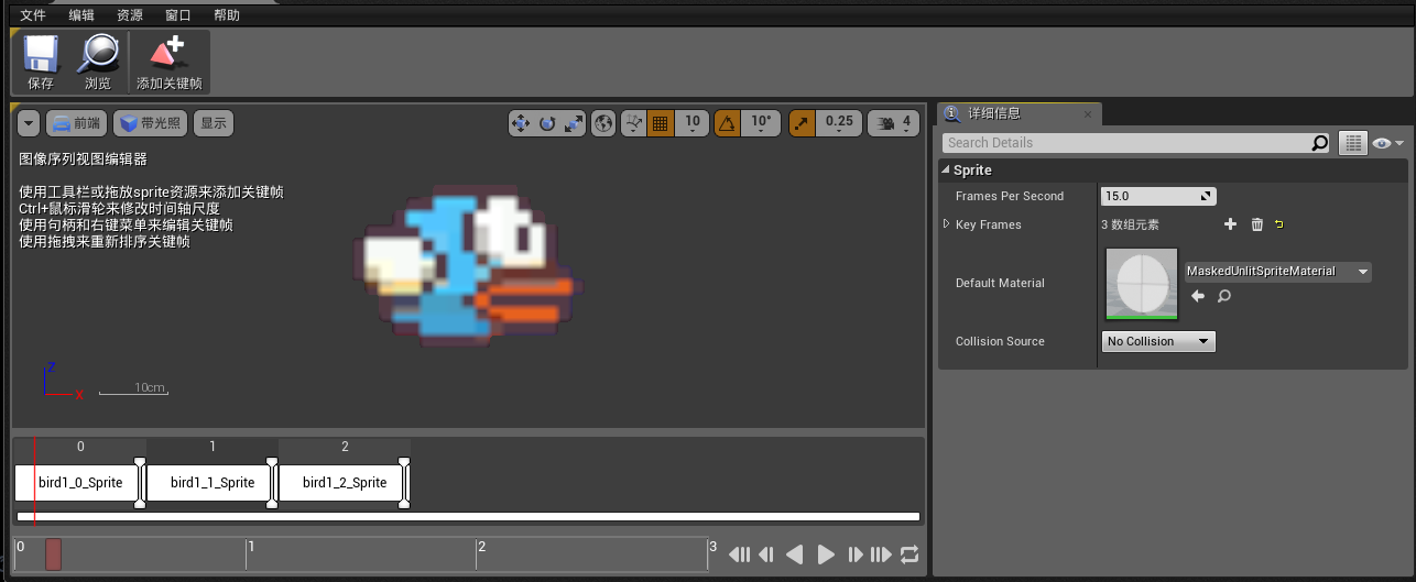可以将Flipbooks看做一种手绘的表现形式,其实就是多张图片摆成一排,快速的播放,产生了动画的效果。在虚幻引擎 4 中,Flipbooks 由一系列关键帧组成,每帧均包含一个需要展示的 Sprite 和展示时长(以帧数为单位)。 每秒帧率 选项将决定帧的播放速度,确定每秒中存在多少动画“节奏”;可在 细节 面板中编辑关键帧,或使用 Flipbook 编辑器 下方的 时间轴 进行编辑。