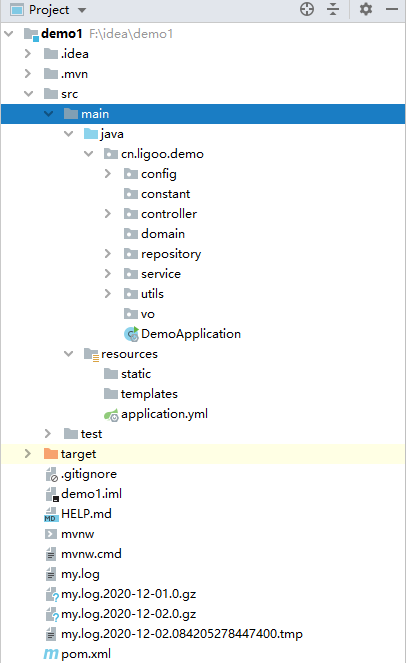 src/main/java:主程序入口 DemoApplication,可以通过直接运行该类来启动 Spring Boot 应用