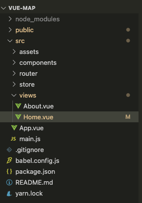 vue create vue-map 安装vue脚手架命令 下面是我的文件目录? Home.vue是主要实现功能的代码