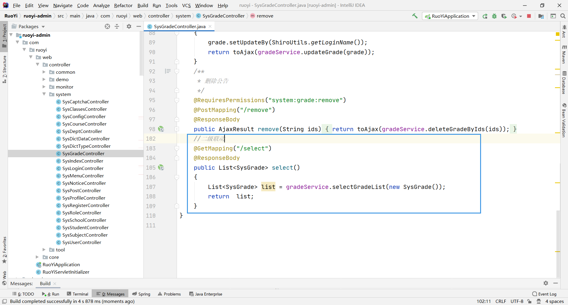 List<SysGrade> list = gradeService.selectGradeList(new SysGrade());