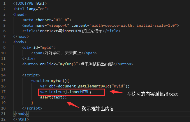 在myfun()函数内,使用innerHTML属性获得div对象内的内容,并使用alert()将获得的内容输出。在浏览器打开html文件,点击按钮,由结果可知,innerHTML属性获得了包括span标签的文本内容。