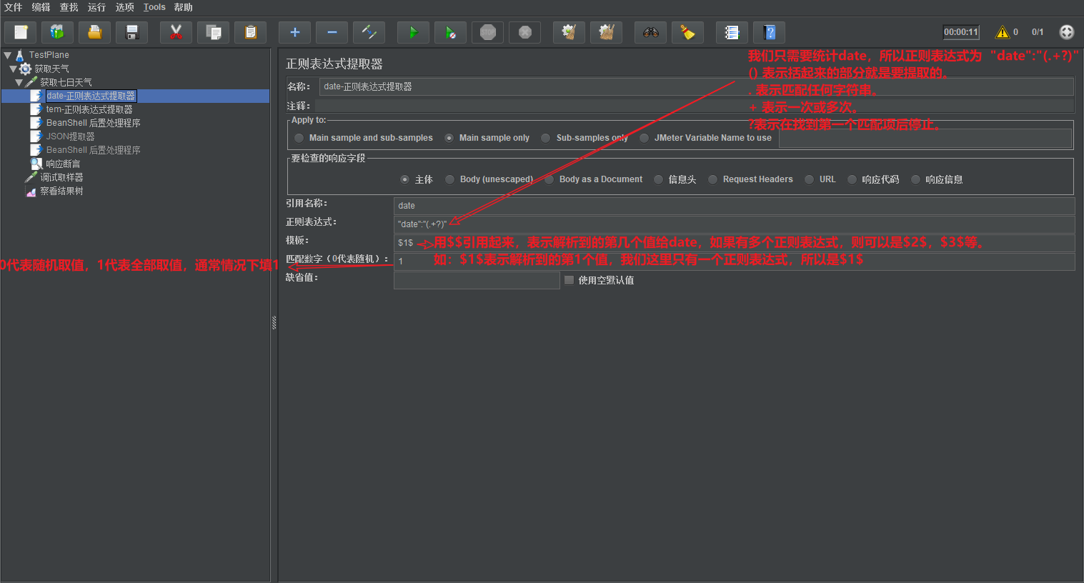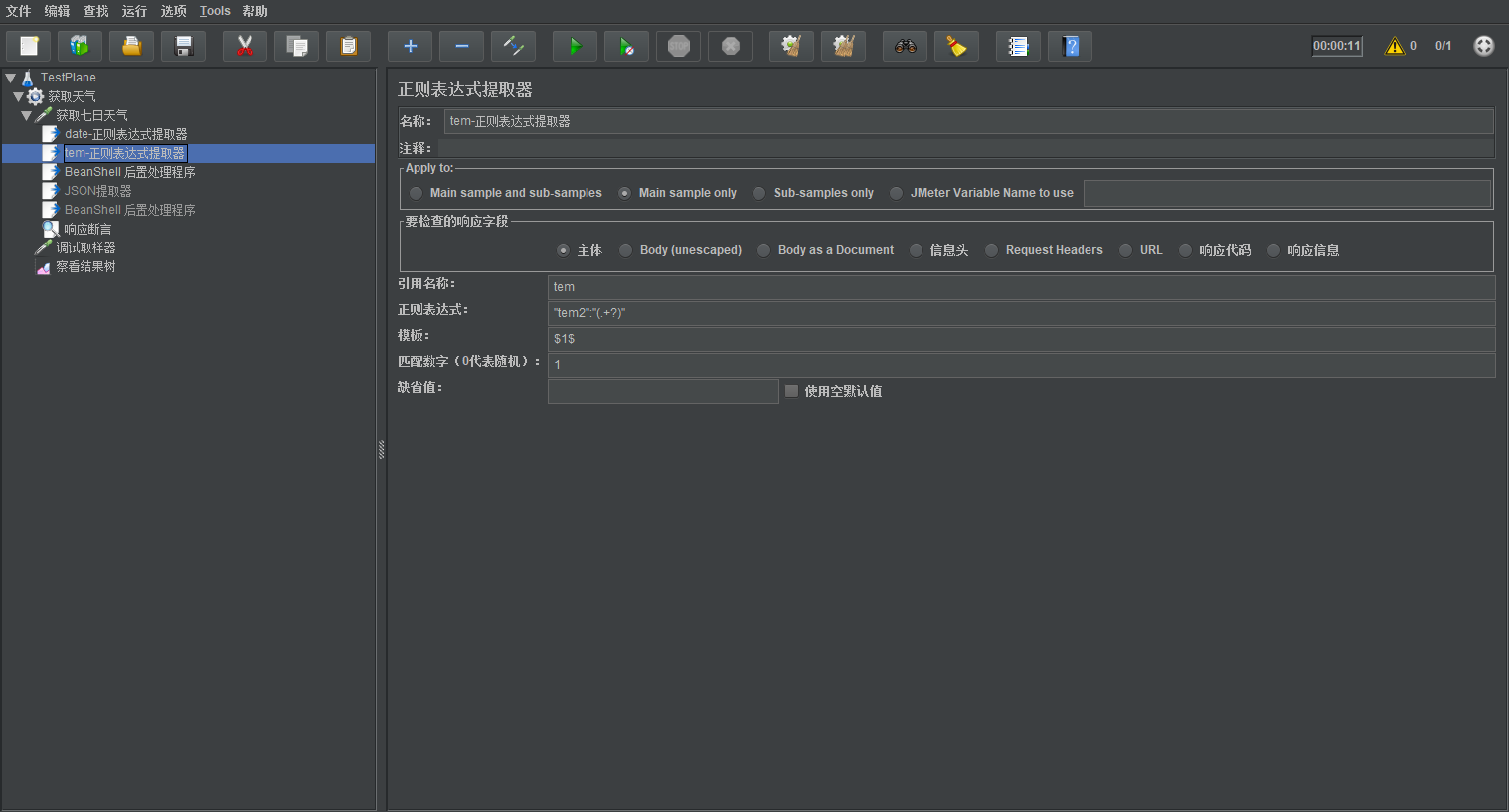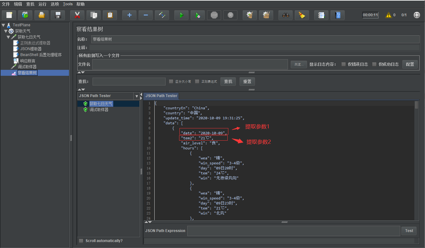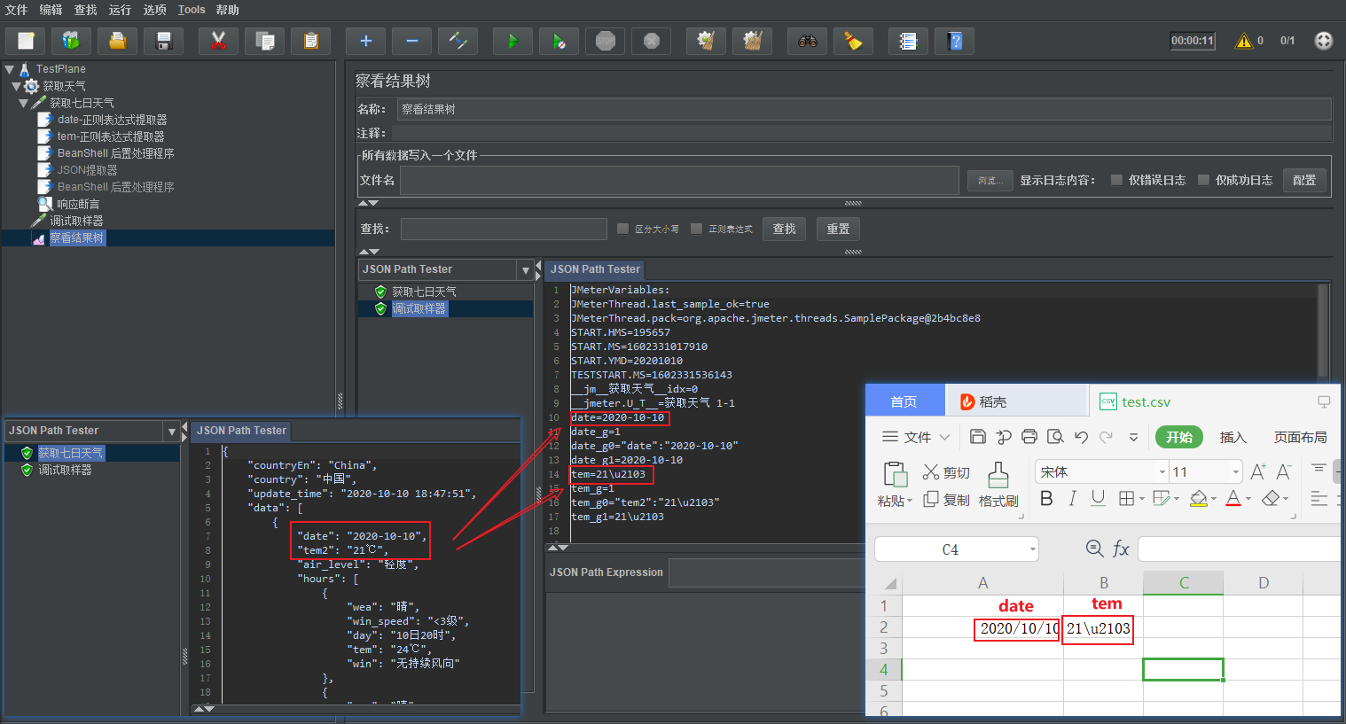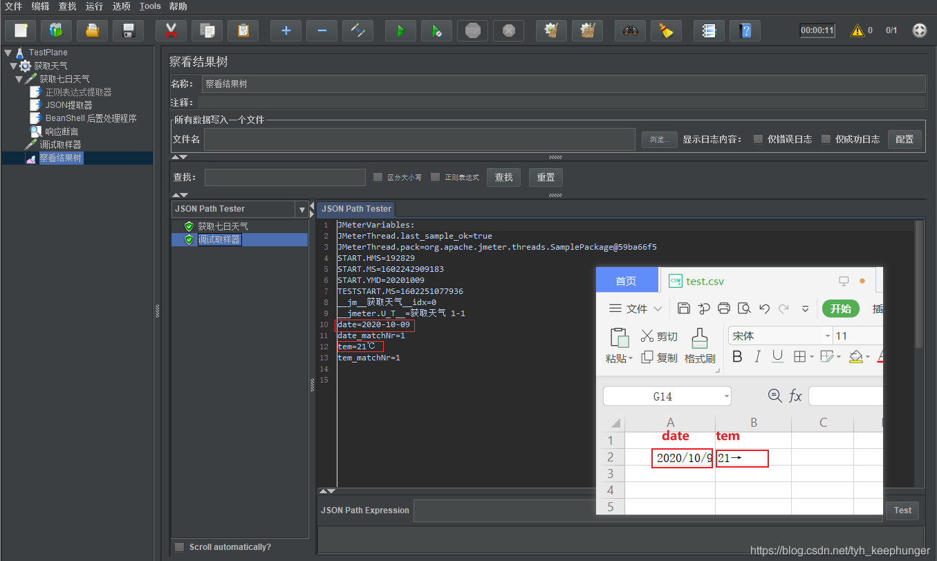 - 点击运行,察看结果树,如果请求成功,打开csv文件查看提取结果;