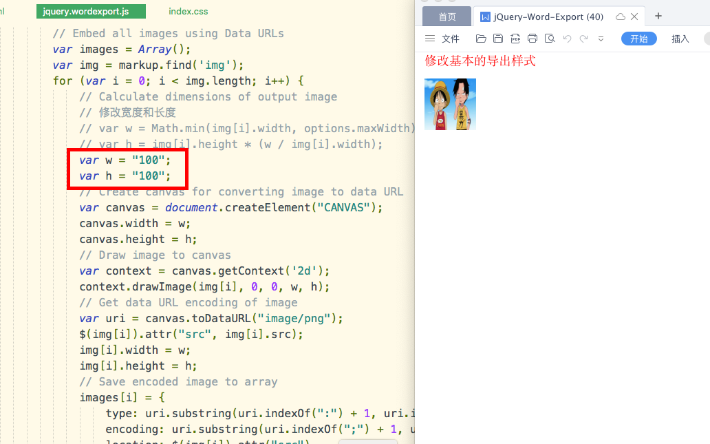 在样式中修改图片大小,但导出成word文档时图片大小还是没有修改,原因是导出成文档时,jquery.wordexport.js是使用canvas对img进行处理,若想修改图片在文档中的大小,需在jquery.wordexport.js中进行修改。