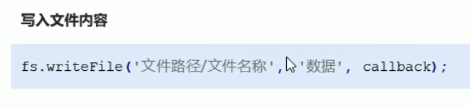 // 写入文件内容 fs.writeFile(‘文件路径/文件名称’,‘要写入的数据’,callback)