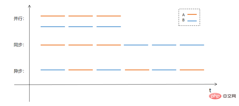 也许用图片的方式解释并行、同步和异步更为直观,假设现在有A、B两个任务需要处理,使用并行、同步和异步的处理方式会分别采用如下图所示的执行方式: