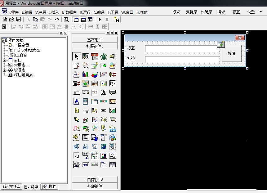 2、打开“易语言”主程序,弹出“新建工程对话框”,选择“Windows窗口程序”然后点击“确定”按钮,进入“Windows窗口”设计界面。如图: