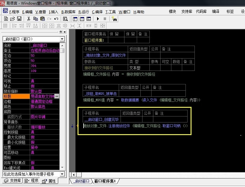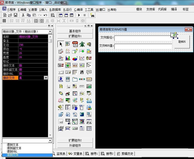 5、万事俱备,只欠编程。下面就开始编写代码吧,键盘已经饥渴难耐了。首先,需要注册一下“拖放对象”,然后选中“拖放对象”控件,修改它的“接收文件”属性为真,选择“得到文件”事件子程序,编写如下代码,果断上图: