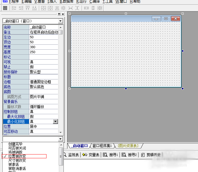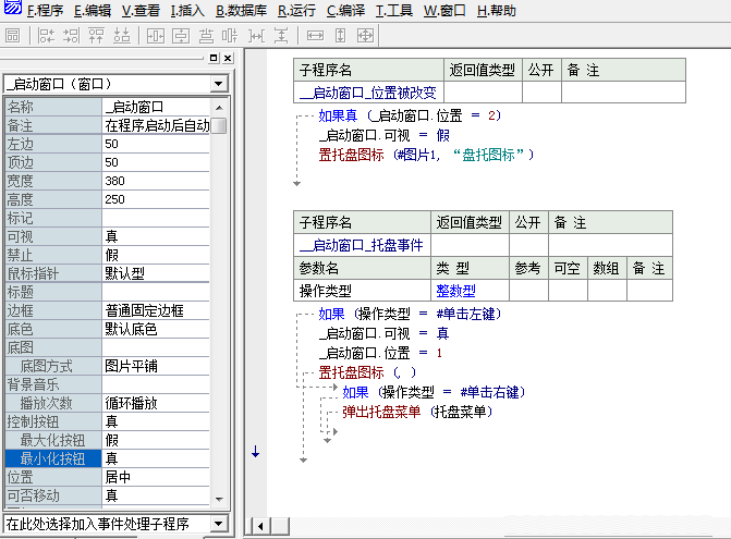 3、当按下窗口的最小化按钮时,程序就置托盘,所以这里窗口“位置被改变”事件下,判断是否被按下,如果被按下,就执行命令,并将程序窗口可视设为假!如下图所示: