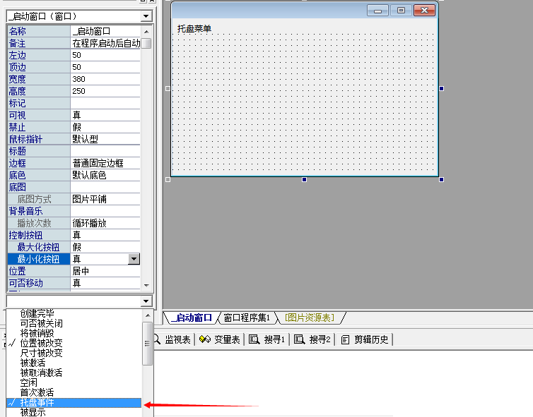 5、在“托盘事件”下,判断鼠标进行何种操作,左键单击将程序还原,右键单击侧弹出菜单!