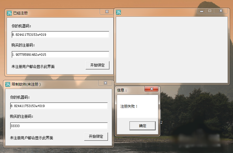 .版本 2 .子程序 _按钮1_被单击 .判断开始 (编辑框2.内容 = 到文本 (到整数 (编辑框1.内容) × 2.384732489327e+014)) _启动窗口.标题 = “已经注册” 信息框 (“注册成功!”, 0, ) 载入(窗口1,,假) .默认 信息框 (“注册失败!”, 0, )