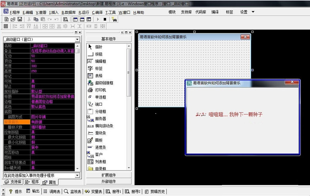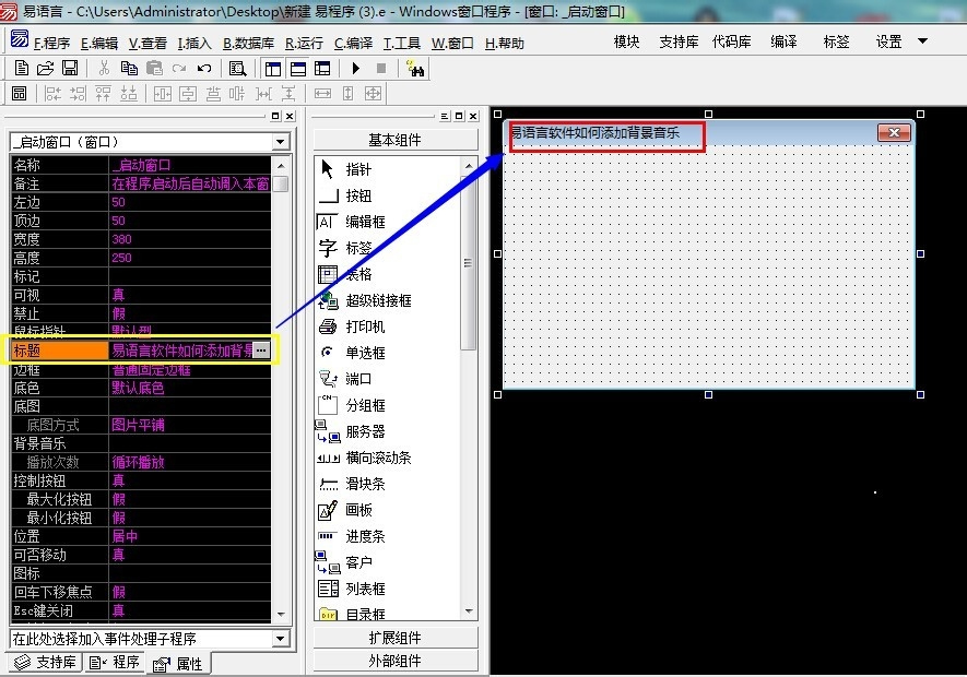 3、修改窗口标题为“易语言软件如何添加背景音乐”,前面已经说过,背景音乐只支持wav、mid两种格式。这里,笔者只演示wav格式。有兴趣的朋友可以自己测试mid格式。