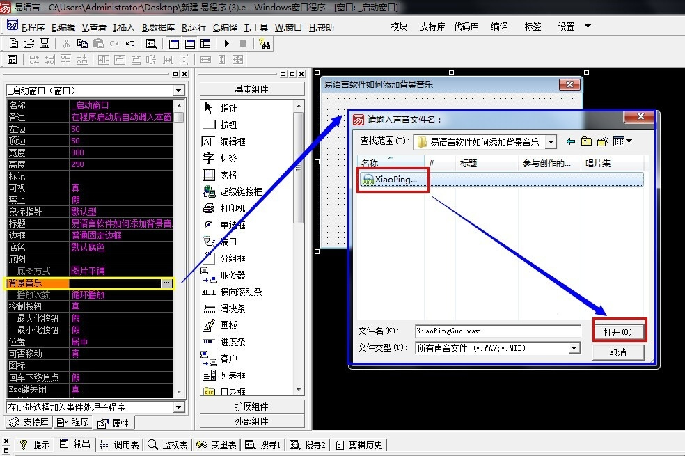 4、“各部门”已经就位,“主角”闪亮登场吧!在“_启动窗口”的“背景音乐”属性中,添加相应声音文件,如图所示: