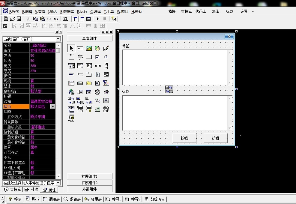 2、在创建好的窗口上,绘制两个编辑框组件,两个标签组件及两个按钮组件。调整相应组件的大小和位置。如图:
