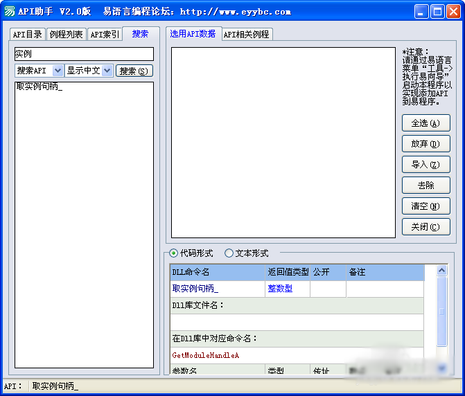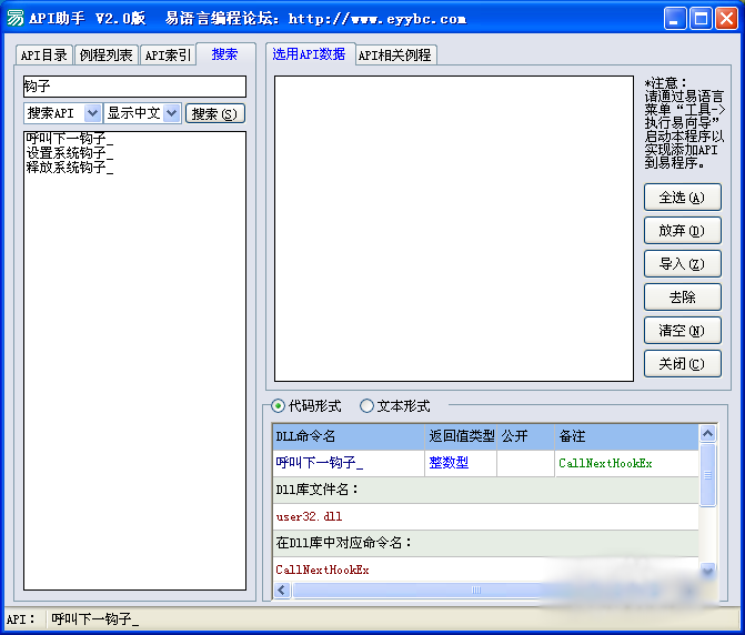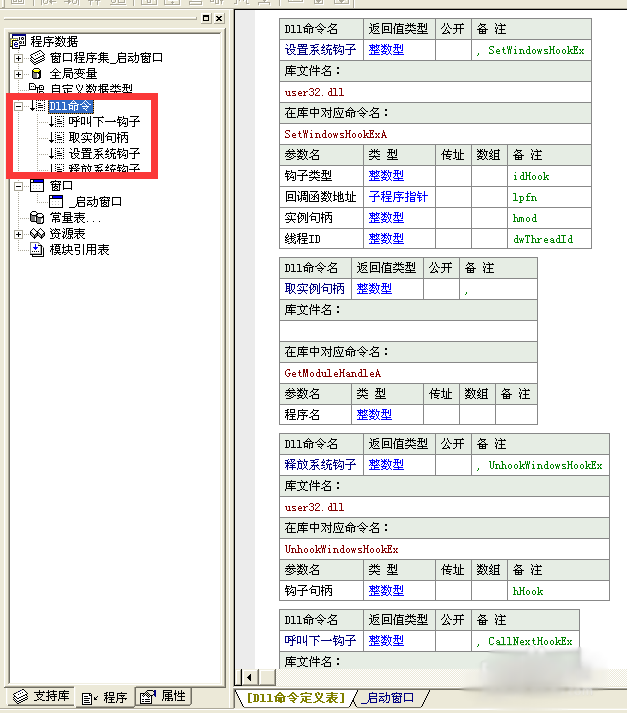 .版本 2 .DLL命令 安装系统钩子, 整数型, "user32.dll", "SetWindowsHookExA", , , SetWindowsHookEx .参数 钩子类型, 整数型, , idHook .参数 回调函数地址, 子程序指针, , lpfn .参数 实例句柄, 整数型, , hmod .参数 线程ID, 整数型, , dwThreadId .DLL命令 取实例句柄, 整数型, , "GetModuleHandleA", , , .参数 程序名, 整数型 .DLL命令 卸载系统钩子, 整数型, "user32.dll", "UnhookWindowsHookEx", , , UnhookWindowsHookEx .参数 钩子句柄, 整数型, , hHook .DLL命令 呼叫下一钩子, 整数型, "user32.dll", "CallNextHookEx", , , CallNextHookEx .参数 钩子句柄, 整数型, , hHook .参数 代码值, 整数型, , ncode .参数 附加参数1, 整数型, , wParam .参数 附加参数2, 整数型, 传址, lParam