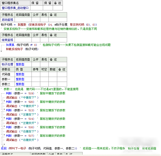.版本 2 .支持库 spec .程序集 窗口程序集_启动窗口 .子程序 启动监视 钩子句柄 = 到整数 (安装系统钩子 (14, &钩子处理, 取实例句柄 (0), 0)) ' 安装系统钩子——安装和卸载和注册热键与注销热键相似的,只是类型不同 .子程序 结束监视 .如果真 (钩子句柄 ≠ 0) ' 检测钩子句柄——如果不检测直接卸载可能会出现问题 卸载系统钩子 (钩子句柄) .如果真结束 .子程序 钩子处理, 整数型 .参数 代码值, 整数型 .参数 参数一, 整数型 .参数 参数二, 整数型 ' 参数一 也就是 键代码——不过是API里面的,不能直接用 .判断开始 (参数一 = 519) ' 鼠标中键按下的参数 调试输出 (“中键按下”) .判断 (参数一 = 520) ' 鼠标中键放开的参数 调试输出 (“中键放开”) .判断 (参数一 = 513) ' 鼠标左键按下的参数 调试输出 (“左键按下”) .判断 (参数一 = 514) ' 鼠标左键放开的参数 调试输出 (“左键放开”) .判断 (参数一 = 516) ' 鼠标右键按下的参数 调试输出 (“右键按下”) .判断 (参数一 = 517) ' 鼠标右键放开的参数 调试输出 (“右键放开”) .默认 .判断结束 返回 (呼叫下一钩子 (钩子句柄, 代码值, 参数一, 参数二)) ' 返回值——用来返回,不然子程序 钩子处理 没有返回值 .子程序 __启动窗口_创建完毕 启动监视 () ' 调用子程序 启动监视 .子程序 __启动窗口_可否被关闭, 逻辑型 结束监视 () ' 调用子程序 结束监视