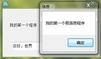 点击按钮。弹出了一个信息框,编辑框的标题也变为了“你好,世界”我们的第一个易语言程序制作完成!