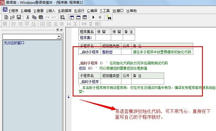 2、进入模块编写界面,真是别有洞天啊。首先有必要讲一下易语言的初始化代码,看注释部分就明白,这段代码是用作测试程序用的,如果实在不理解,直接无视就OK!