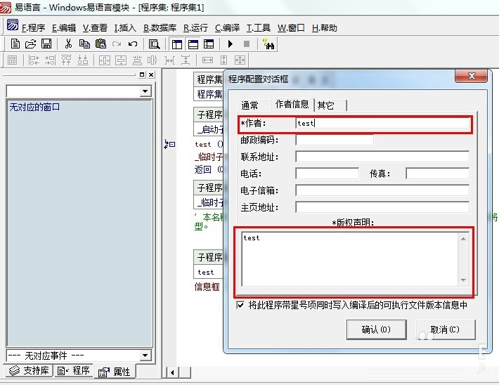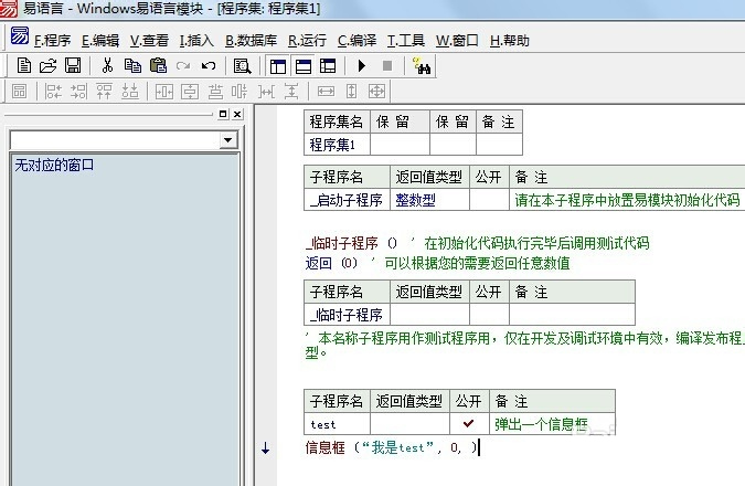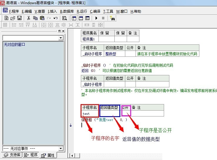 3、开始“实兵演练”,可通过单击鼠标右键弹出菜单并选择“新建子程序”或者按下Ctrl+N键的方式来新建子程序,今天我们就新建一个名叫“test”的子程序,这里有必要说一下相关注意事项:(1)子程序的名字要唯一(2)根据子程序的需要,设置返回值的数据类型,如果无返回值,可留空。(3)设置子程序的公开属性,模块是方便其他程序猿调用的,所以公开要打勾。(4)为了便于程序的开发编写,做好备注是个好习惯。提示自己及其他人此子程序的功能是什么。接下来,就是写代码了,我们就以信息框为例!写完代码记得将公开打“√”和添加备注。