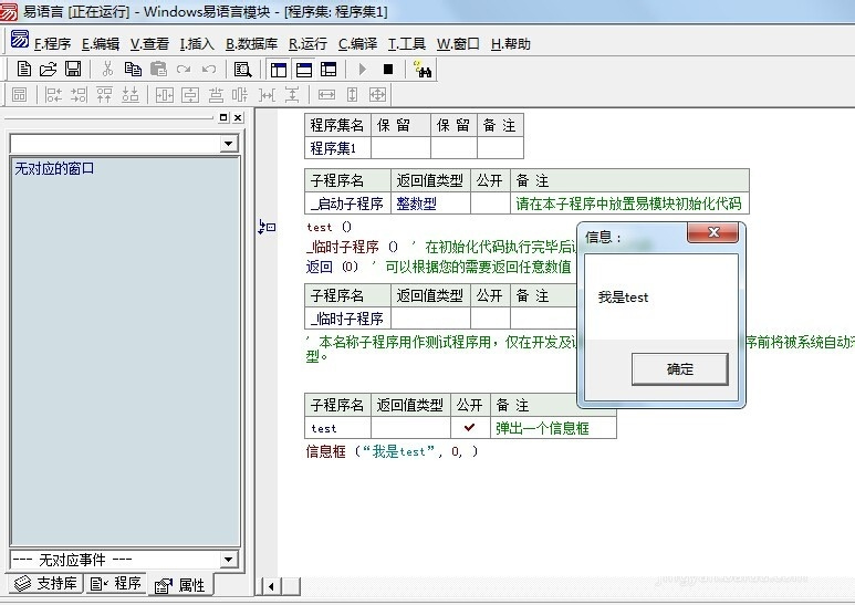4、代码编写完毕之后,就是检验成果的时候了,测试阶段不能少。将“test”子程序写在“_启动子程序”下,代码如下图所示,然后,按下F5键见证“奇迹”吧!