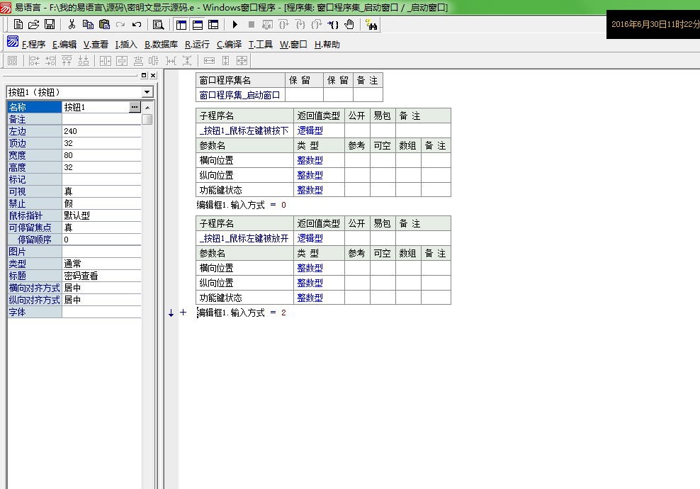 .版本 2 .程序集 窗口程序集_启动窗口 .子程序 _按钮1_鼠标左键被按下, 逻辑型 .参数 横向位置, 整数型 .参数 纵向位置, 整数型 .参数 功能键状态, 整数型 编辑框1.输入方式 = 0 .子程序 _按钮1_鼠标左键被放开, 逻辑型 .参数 横向位置, 整数型 .参数 纵向位置, 整数型 .参数 功能键状态, 整数型 编辑框1.输入方式 = 2