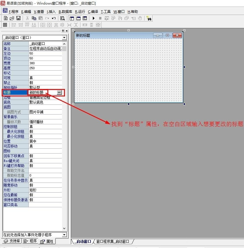 3、在窗体属性面板中找到“标题”属性,在该属性对应的输入框中输入想要更改的标题,这就是易语言静态更改窗口标题的方法