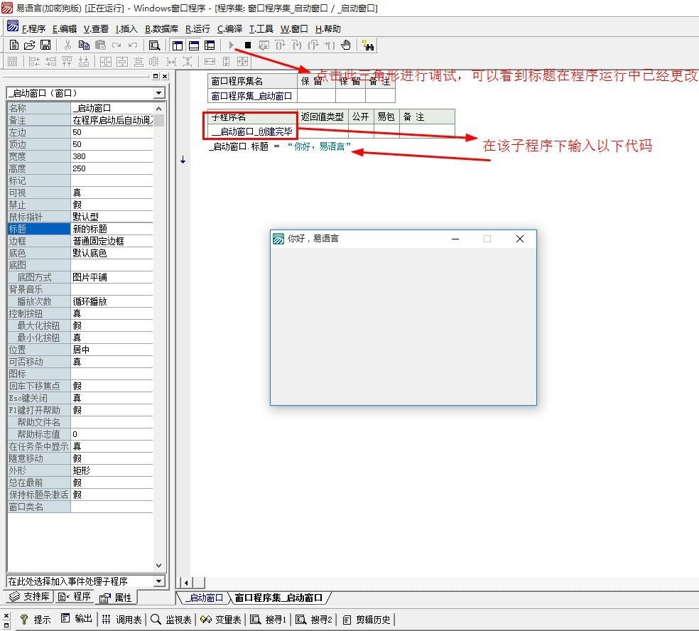 2、在“__启动窗口_创建完毕”子程序下,输入:_启动窗口.标题 = “想要更改的标题”字样,再点击工具栏中的三角形进行调试。这就是易语言动态更改窗口标题的方法。