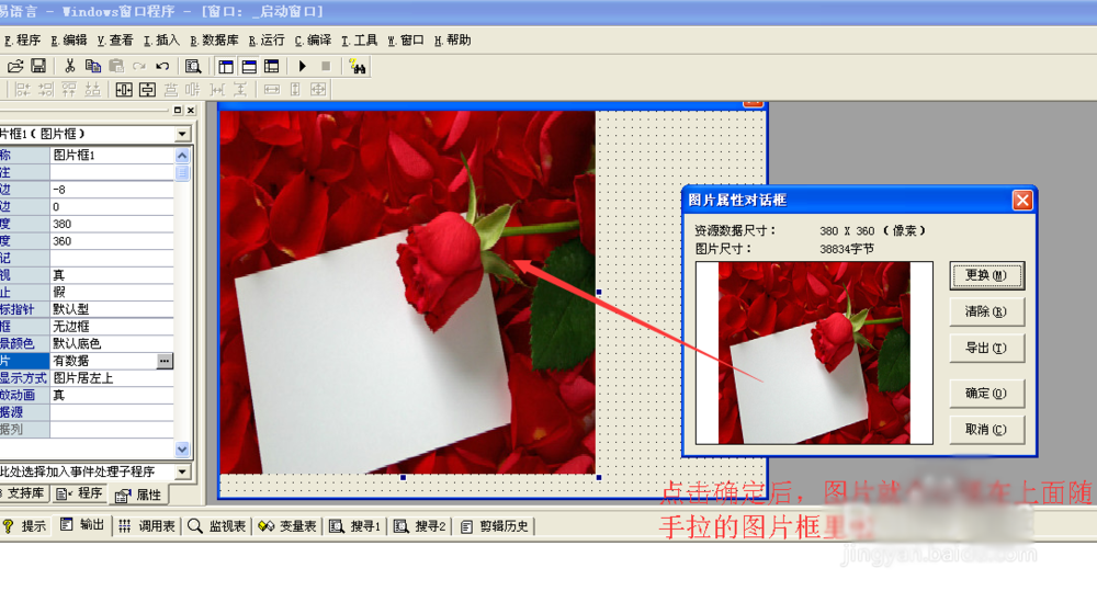2、点击易语言右边的图片按钮,在左边的框内随机拉出图片尺寸的一个方框