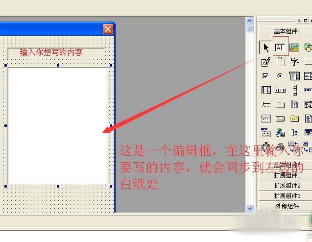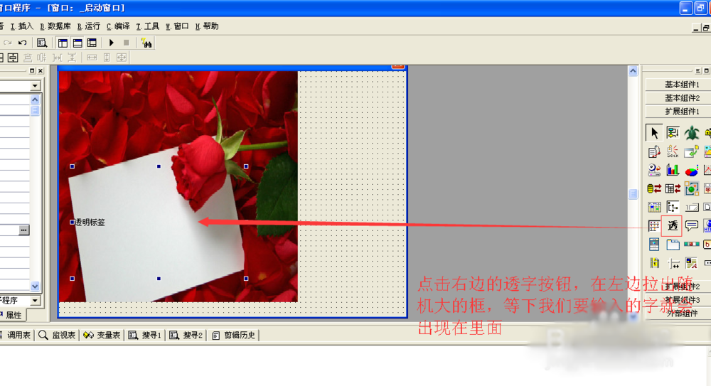 7、点击右边的扩展组件1在里面寻找一个标有“透”的字样单击,在我们的图片上面拉出一定的方框,我们用来和刚才的那个小A同步文字的