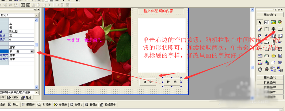 8、点击右边的空白像按钮的那个,那个就是按钮,我们要在标签的下面拉取两个,我们输入的字要点去,确认,取消,来确认我们的字要不要输入在透明标签里