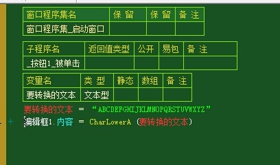 .版本 2 .程序集 窗口程序集_启动窗口 .子程序 _按钮1_被单击 .局部变量 要转换的文本, 文本型 要转换的文本 = “ABCDEFGHIJKLMNOPQRSTUVWXYZ” 编辑框1.内容 = CharLowerA (要转换的文本)